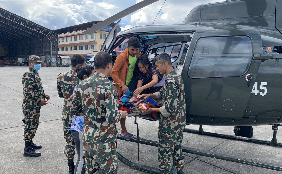 सिन्धुपाल्चोककी एक गर्भवती महिलालाई हेलिकप्टरबाट उद्दार गरी उपचारका लागि काठमाडौं ल्याइएको छ।