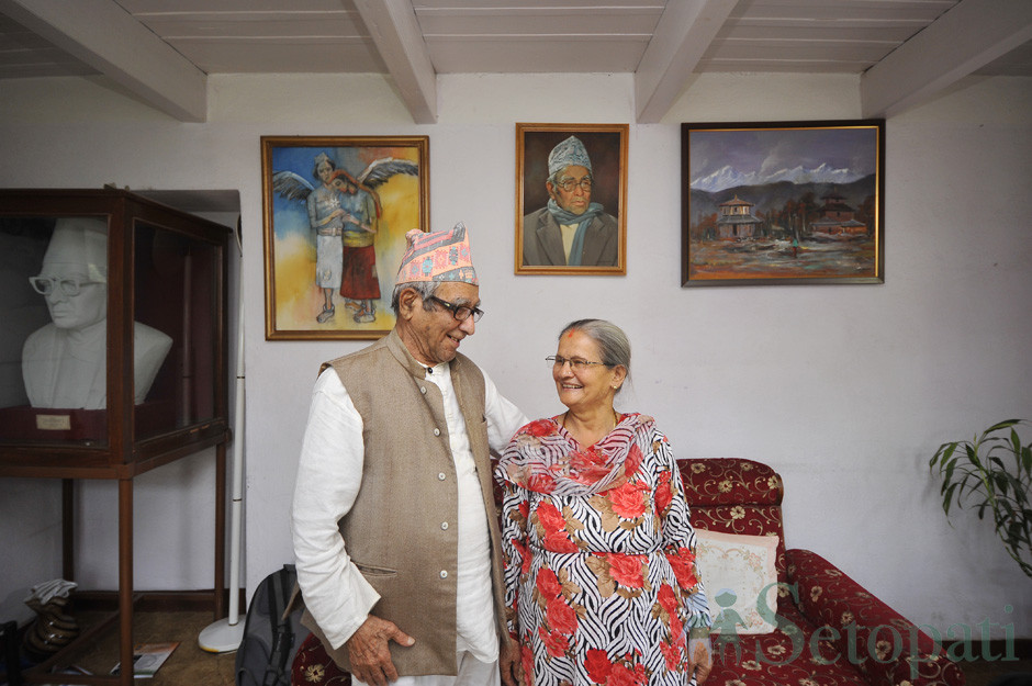 पत्नी महाकालीका साथमा माधव घिमिरे। तस्बिर: नारायण महर्जन/सेतोपाटी