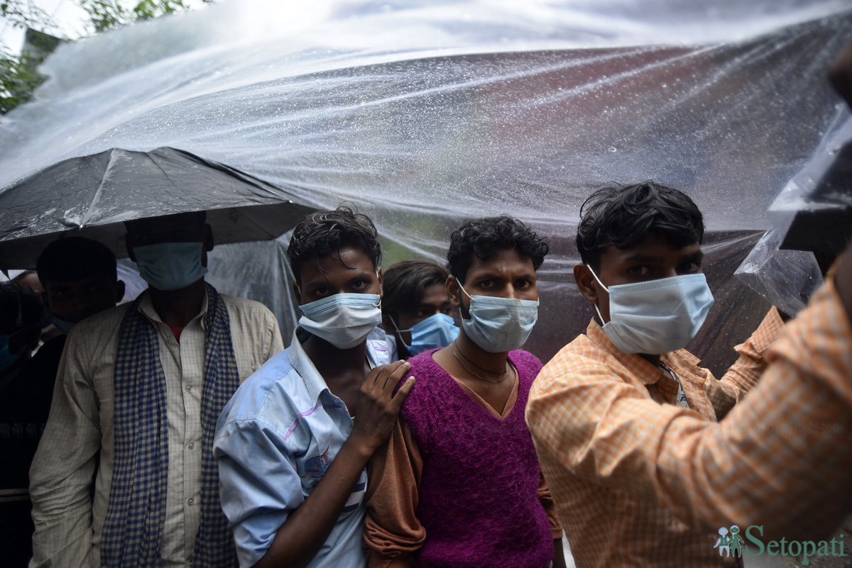 बिहीबार दिउँसो झरी परिरहेका बेला पनि उनीहरू छाता, प्लाष्टिक ओढेर झरीमा उभिइरहे।