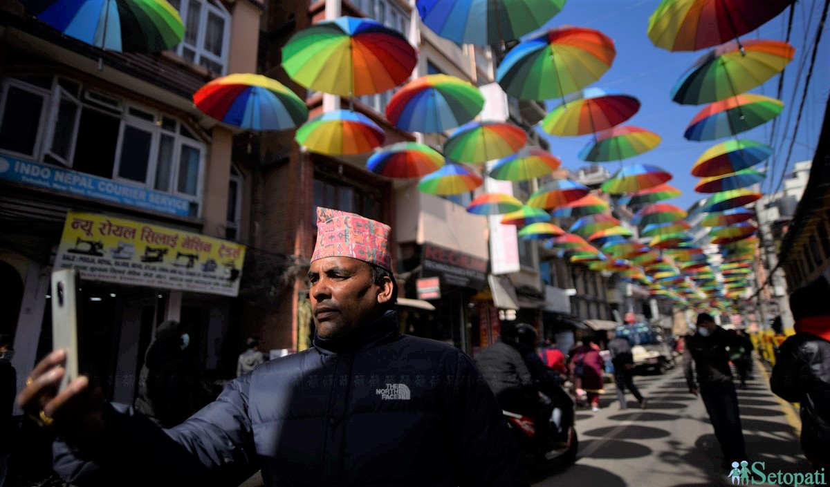 कोरोनापछि लगभग सुनसान यो गल्लीमा अचेल ठेलामठेल गर्दै मान्छेको घुइँचो छिचोल्नुपर्छ। यो भिडको कारण हो यहाँ सजाइएका रंगीविरंगी छाता। दुई साताअघि स्थानीयवासी, संकटा क्लब र वडाको सहकार्यमा यो सडकको माथिमाथि रंगीविरंगी छाता झुन्ड्याइएको हो।