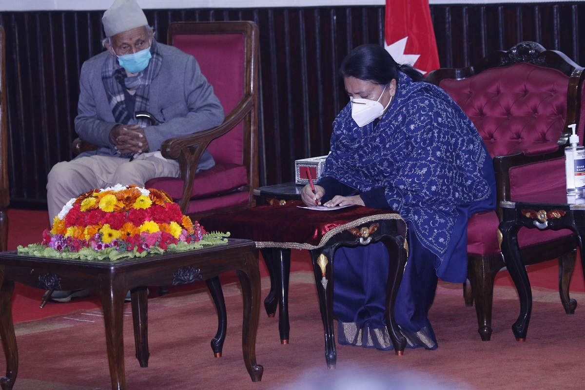 राष्ट्रपति विद्यादेवी भण्डारीले वाङ्मय शताब्दी पुरुष सत्यमोहन जोशीको तस्वीराङ्कित हुलाक टिकटको प्रथम दिवसीय आवरणमा टाँचा प्रदान गरेकी छिन् ।