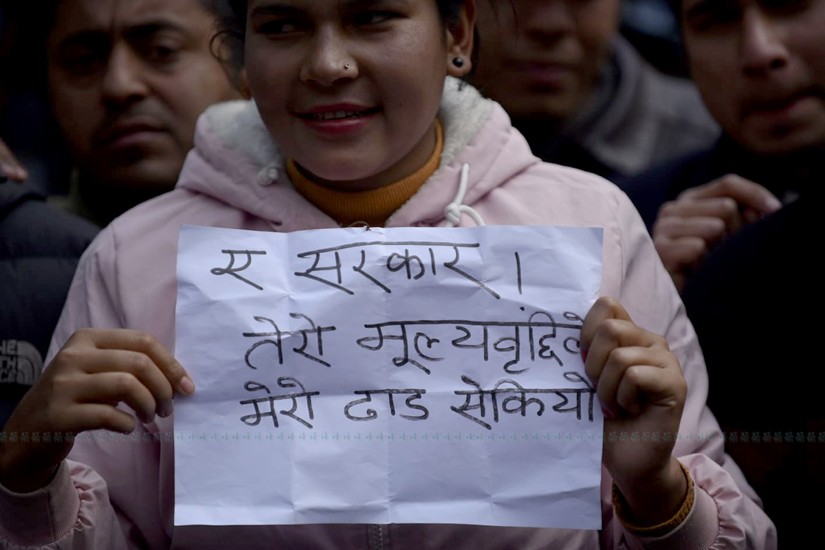 विद्यार्थीहरूले कालोपट्टि बाँधेर नाराबाजी गरेका थिए। उनीहरूले मूल्यवृद्धि फिर्ता गर, महँगी बढाउन पाइँदैन, जनतामाथि ऋणको भार यही हो तिम्रो समाजवाद लगायतका नारा लगाएका थिए।