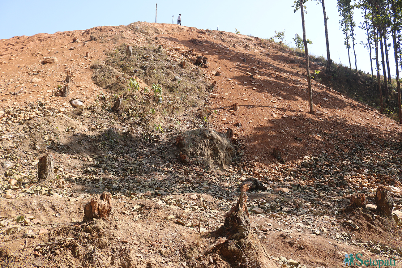 ‘त्यो डाँडोको मुन्तिर ज-जसको जग्गा जमिन छ, ती सबैले मिलेर रूख काटेका हुन्,’ एक स्थानीय युवाले भने, ‘उनीहरूले डाँडोमा डोजेर चलाएर बाटोसमेत निकालिसके।’
