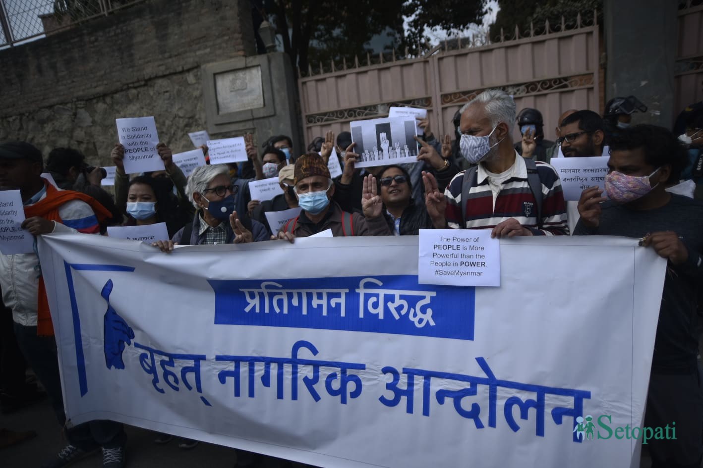म्यानमारमा भइरहेको सैन्य दमनको विरोधमा शुक्रबार ललितपुरस्थित म्यानमार दूतावासअगाडि विरोध प्रदर्शन गरिएको छ।बृहत् नागरिक आन्दोलनको अगुवाइमा भएको प्रदर्शनमा नागरिक अभियन्तारूले नक्खु, भैंसेपाटीस्थित दूतावासअगाडि प्रदर्शन गरेका हुन्।