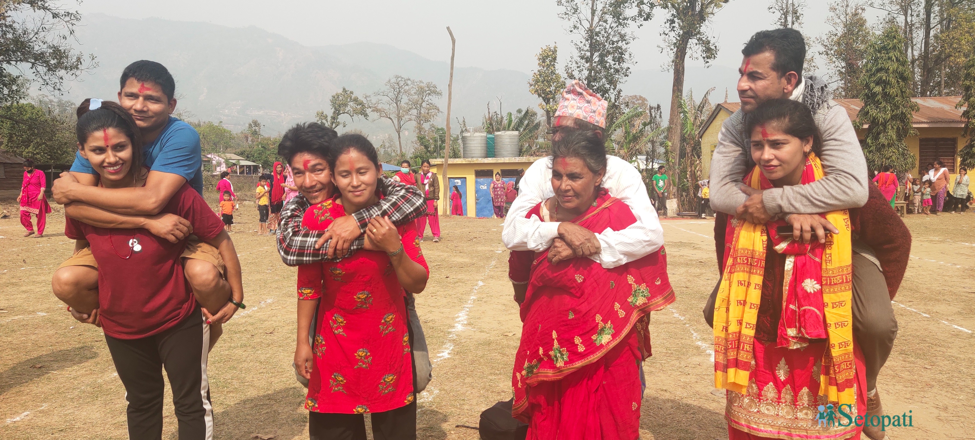 तनुहँको देवघाट गाउँपालिकाले सोमबार नारी दिवसको अवसर पारेर श्रीमातीले श्रीमान बोकेर दौडने अनौठो प्रतिस्पर्धीको आयोजना गरेको थियो।