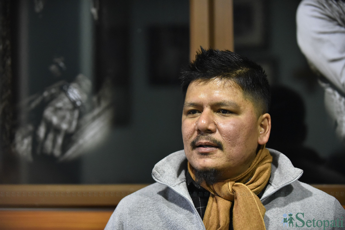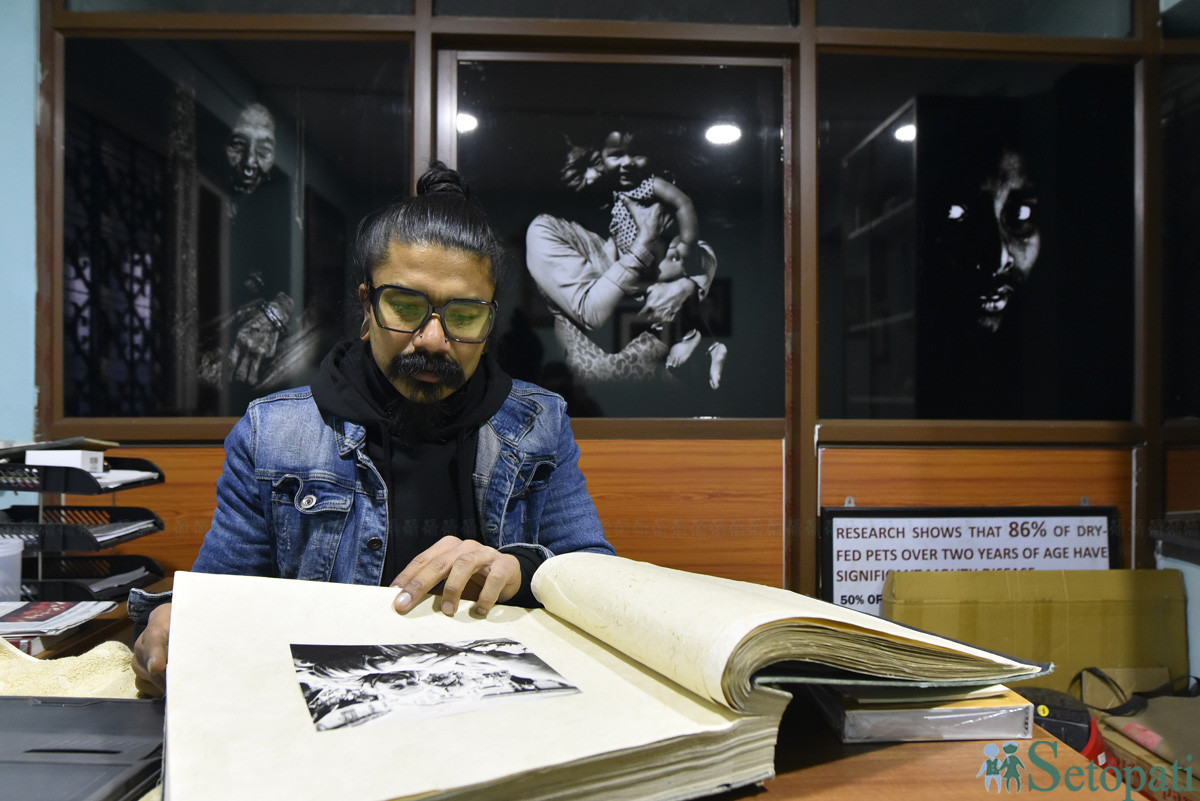 पशुचिकित्सक प्रनव जोशीलाई फोटोग्राफीको रूचि पनि छ। पछाडि पृष्ठभूमिमा देखिएका फोटा उनैले खिचेका हुन्। तस्बिरः नारायण महर्जन/सेतोपाटी