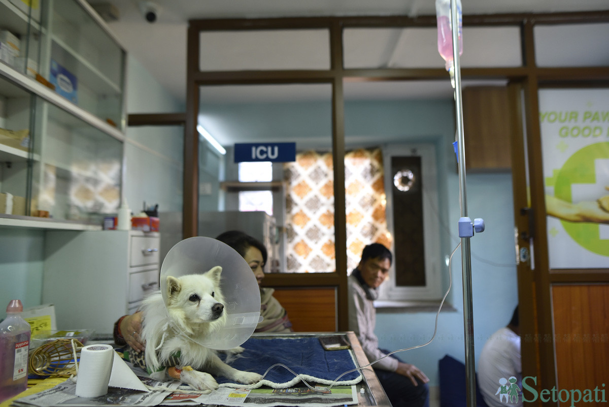 प्रनव जोशीको क्लिनिकमा उपचाररत कुकुर। तस्बिरः नारायण महर्जन/सेतोपाटी