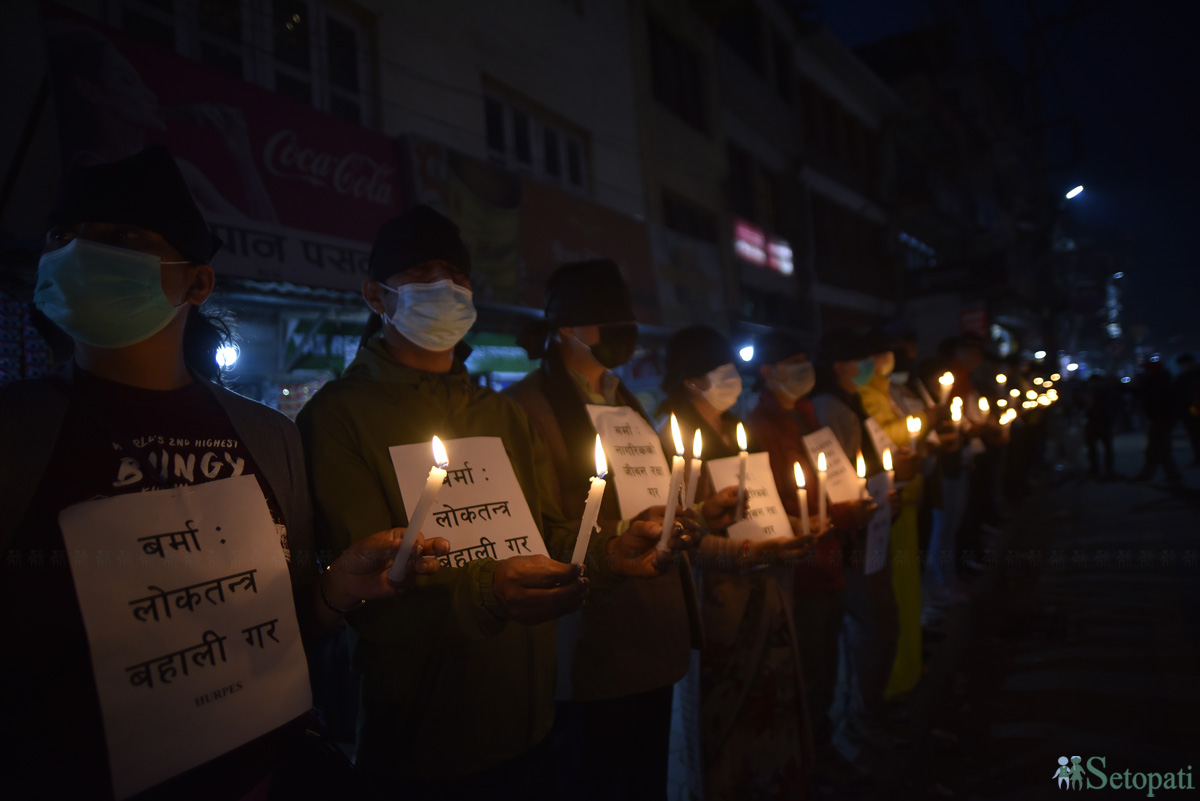 म्यानमार (बर्मा) का नागरिकको जीवन रक्षा, शान्ति र लोकतन्त्र वहालीको मागसहित मानव अधिकार तथा शान्ति समाजद्वारा साँझ ६ः३० देखि ७ बजेसम्म बौद्धनाथ अगाडि आयोजित प्रदर्शनमा शान्ति समाजका संस्थापक सभापति कृष्ण पहाडी, सभापति गोविन्द खनाल, सल्लाहकार उत्तम पुडासैनी, पूर्व सभापति होमकान्त चौलागाई, उपसभापति रत्नलक्ष्मी श्रेष्ठ, महासचिव रामकृष्ण बराल, कोषाध्यक्ष जगन्नाथ पुडासैनी, केन्द्रीय सदस्य चन्द्रमणी बञ्जारा, अधिकारकर्मीहरु गीता तिमल्सिना, दुर्गा राना, उमा गौतम, रुपा गिरी, रोज विष्ट, नानीकाजी गिरी, ईश्वर पुडासैनी, किरण ढकाल, यदु खतिवडासहित ५ दर्जन शान्तिवादीहरुको सहभागिता थियो।