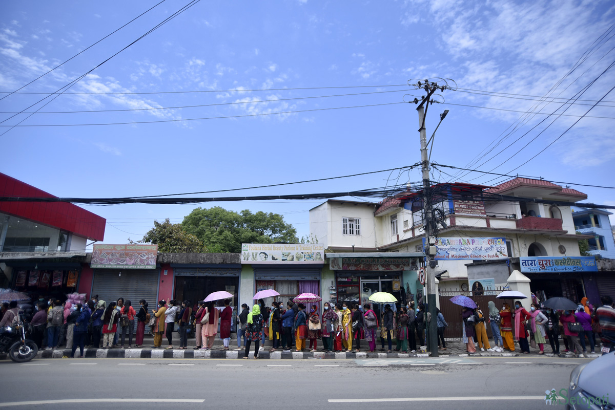 चिनियाँ कम्पनी सिनोफार्मको भेरोसेल खोप लगाउन उनीहरू लाइनमा बसेका छन्। मानिसको भिड अल्कादेखि जावलाखेल चोकसम्मै पुगेको छ।