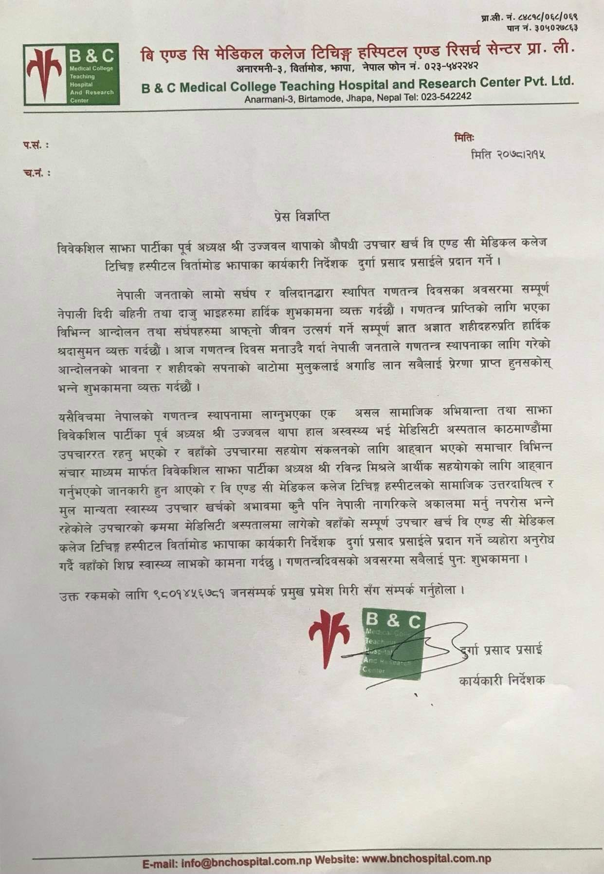 बिएण्डसी मेडिकल कलेज विर्तामोडले विवेकशील साझा पार्टीका पूर्वअध्यक्ष उज्जवल थापाको सबै उपचार खर्च व्यहोर्ने घोषणा गरेको छ।