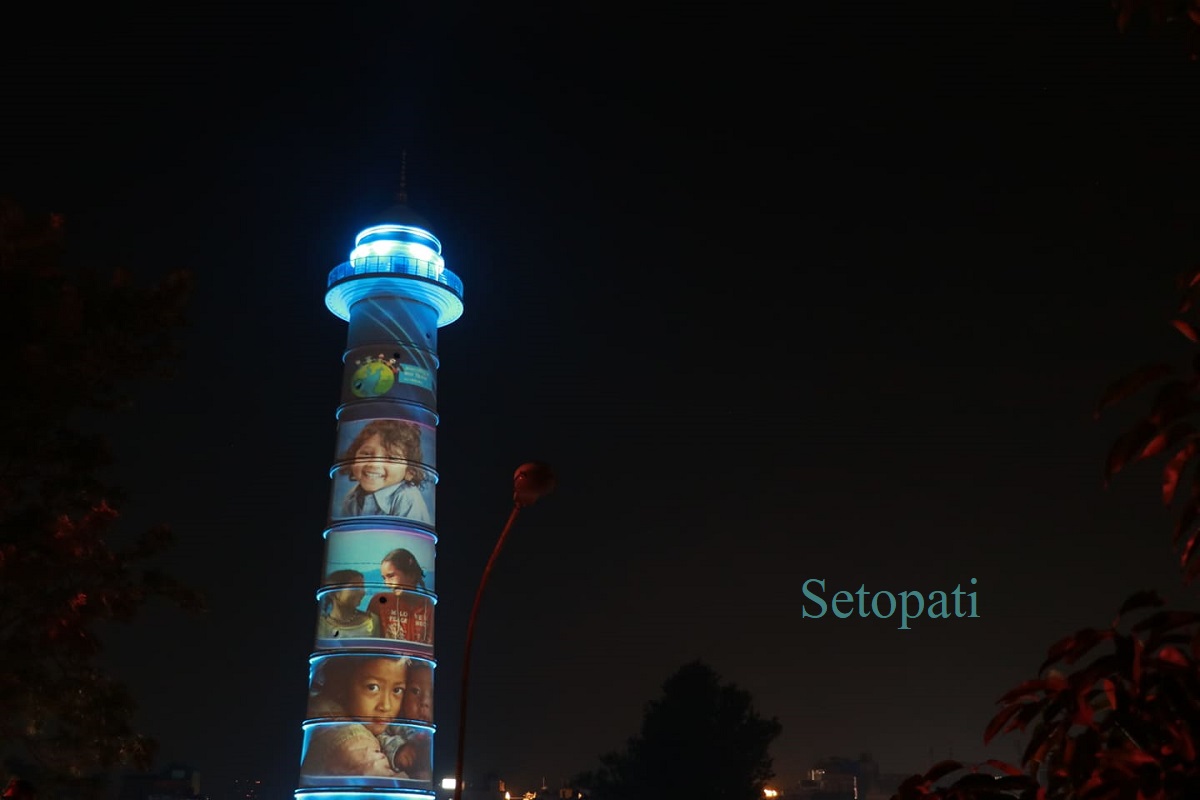 अन्तर्राष्ट्रिय बाल दिवसका अवसरमा शनिबार काठमाडौंका दुई महत्वपूर्ण ऐतिहासिक सम्पदालाई निलो रंगको पृष्ठभूमिमा सजाइएको छ।