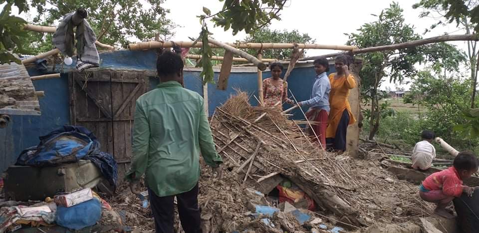 वडा नम्बर ७ मा एतवरी टुडू, कार्तिक राजवंशी, मेनी राजवंशी, वीरे राजवंशी, पवन राजवंशी लगायतको फुसको घर हावाले उडाएको हो। पवन राजवंशीका अनुसार अन्नपात भिजेर नष्ट भएको छ।