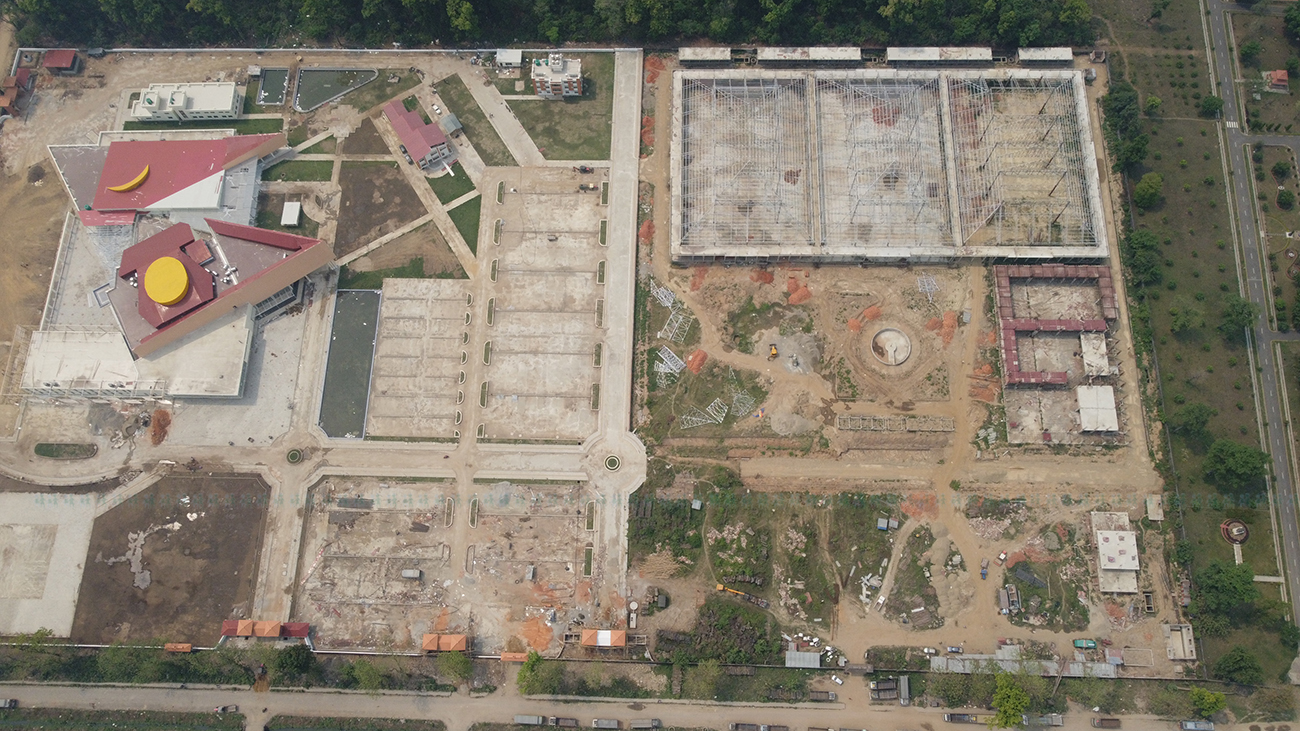 आकाशबाट हेर्दा चन्द्र-सूर्य अंकित नेपालको झण्डा आकारमा निर्माण गरिएको सम्मेलन केन्द्र डिजाइन गरिएजस्तै आकर्षक देखिएको छ।