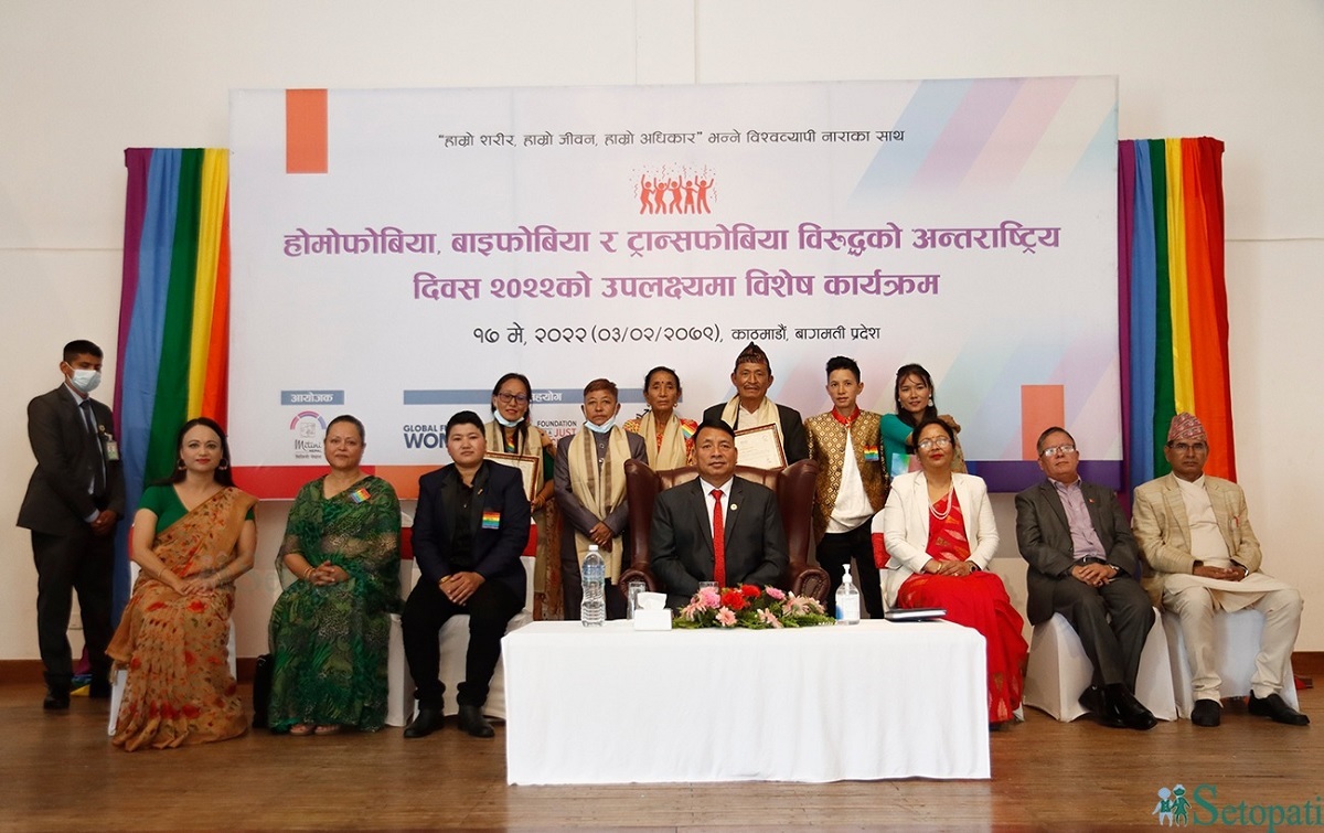 मंगलबार होमोफोबिया, बाइफोबिया र ट्रान्सफोबिया विरुद्धको अन्तर्राष्ट्रिय दिवसको अवसरमा मितिनी नेपालले आयोजना गरेको कार्यक्रममा बोल्दै उनले भने, ‘यौनिक तथा लैंगिक अल्पसंख्यक समुदायलाई बिना भेदभाव स्वीकार गर्नुपर्ने कुरामा राज्यको पनि प्रतिबद्धता रहेको छ।’
