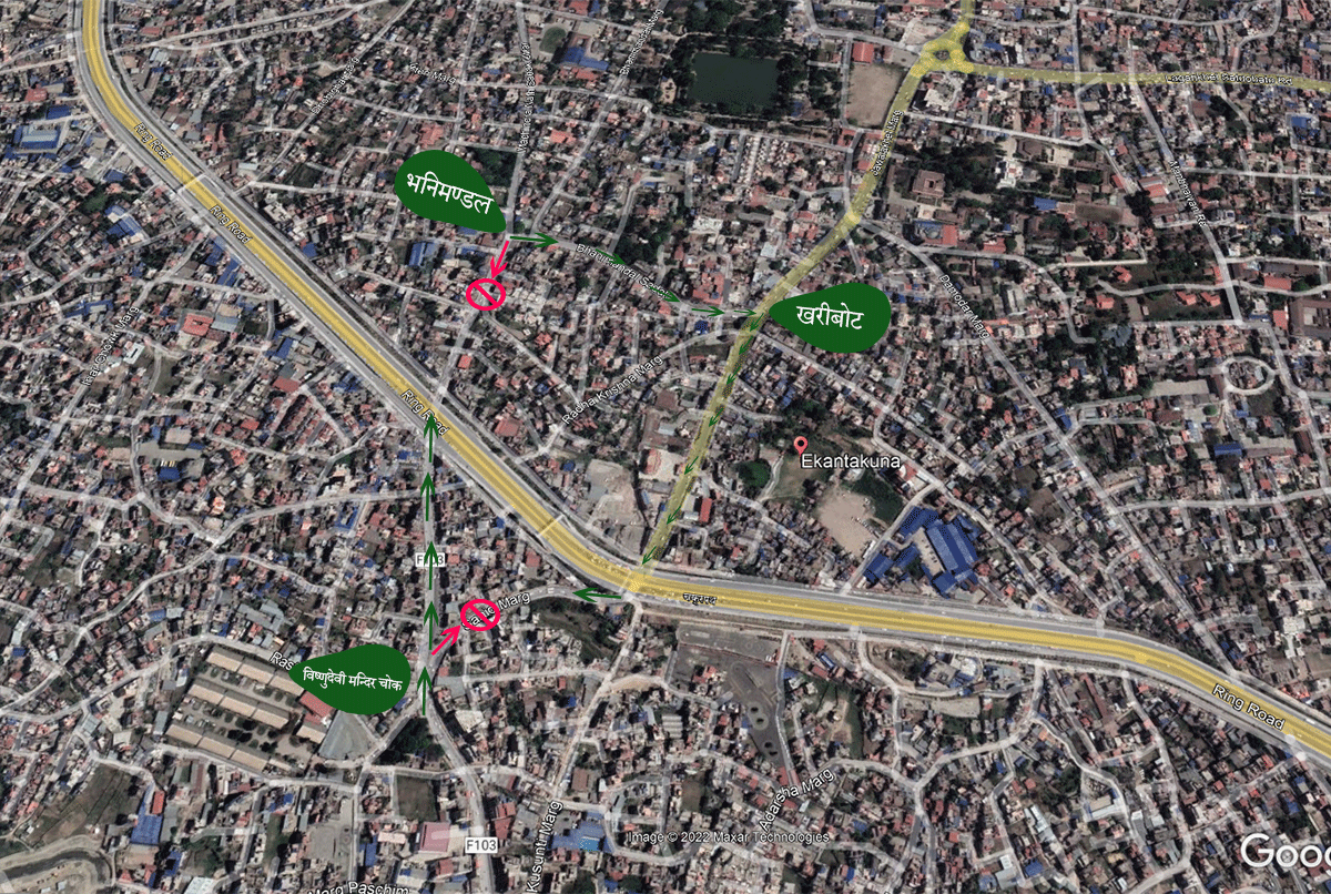 ललितपुरको एकान्तकुनाबाट विष्णुदेवी मन्दिर हुँदै नख्खु- भैंसेपाटी जाने सडक एकतर्फी बनाइएको छ।