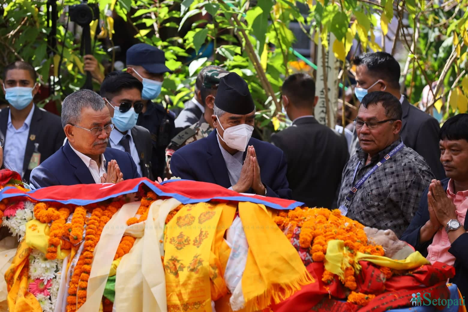 ललितपुर महानगरपालिका परिसरमा राखिएको पार्थिव शरीरमा प्रधानमन्त्री देउवाले नेपालको झन्डा ओढाएका हुन्। उनीसँगै ललितपुर महानगरपालिकाका मेयर चिरिबाबु महर्जनले पनि ओढाएका थिए।