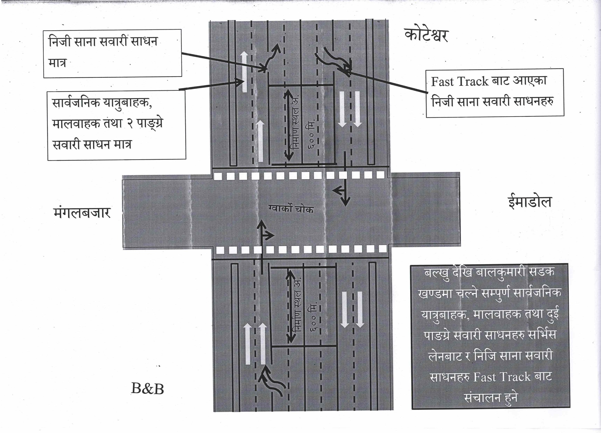 बल्खुबाट सातदोबाटो हुँदै कोटेश्वरतर्फ जाने यात्रुबाहक, मालबाहक तथा दुई पाङ्ग्रे सवारी साधनलाई बल्खुबाट सर्भिस लेनमा र साना चारपाङ्ग्रे सवारी साधनलाई फास्ट ट्र्याकबाट सञ्चालन गरिने कार्यालयको तयारी छ।