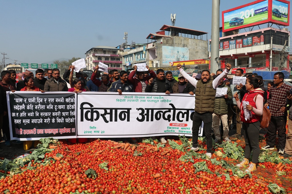 टमाटर, काउली, बन्दालगायतका तरकारी बोकेका गाडीसहित नारायणगढ पुगेका किसानहरूले पूर्व-पश्चिम राजमार्ग बन्द गरेर प्रदर्शन गरिरहेका छन्।