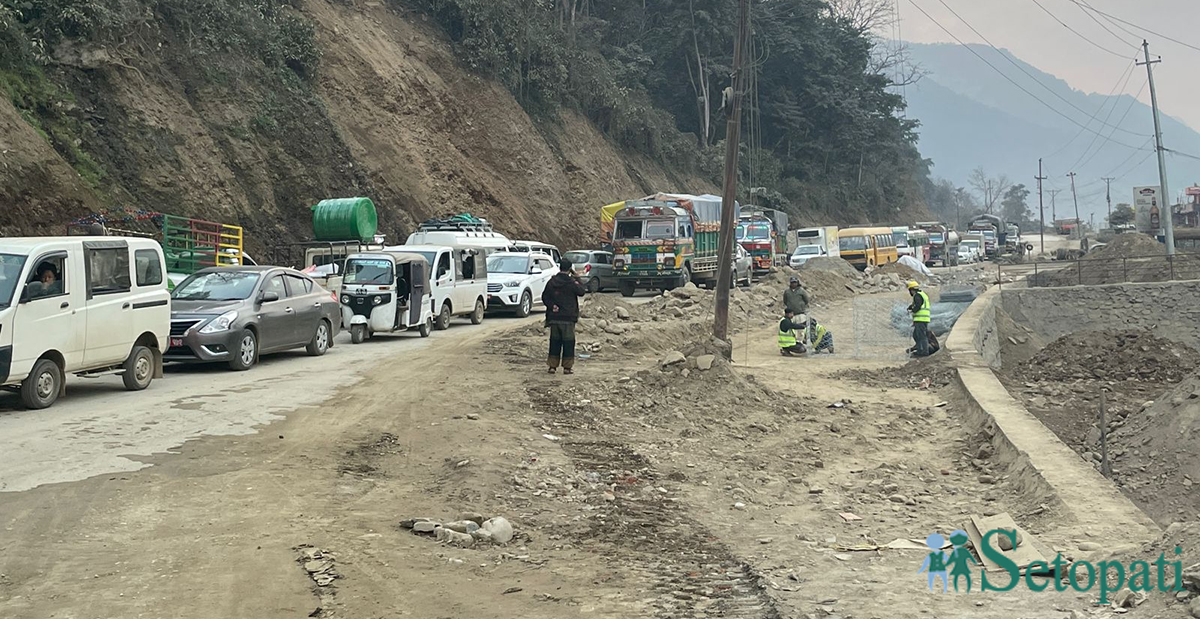 केही दिनअघि हामी पुग्दा राजमार्गका केही ठाउँमा मात्रै काम भइरहेको थियो। सडक विस्तारका लागि अहिले भित्ता काट्ने, रिटेनिङ वाल बनाउने, नाली, कल्भर्ट बनाउने कामहरू भइरहेका छन्। काम सुस्त गतिमा हुँदा यात्रु र राजमार्ग आसपासका बासिन्दाहरूले हिलो र धुलोको सास्ती पाइरहेका छन्। ट्राफिक जामको समस्या झेलिरहेका छन्। सीमित कामदारले सुस्तगतिमा काम गर्दा सडक विस्तारले गति लिन नसकेको देखिन्छ।
