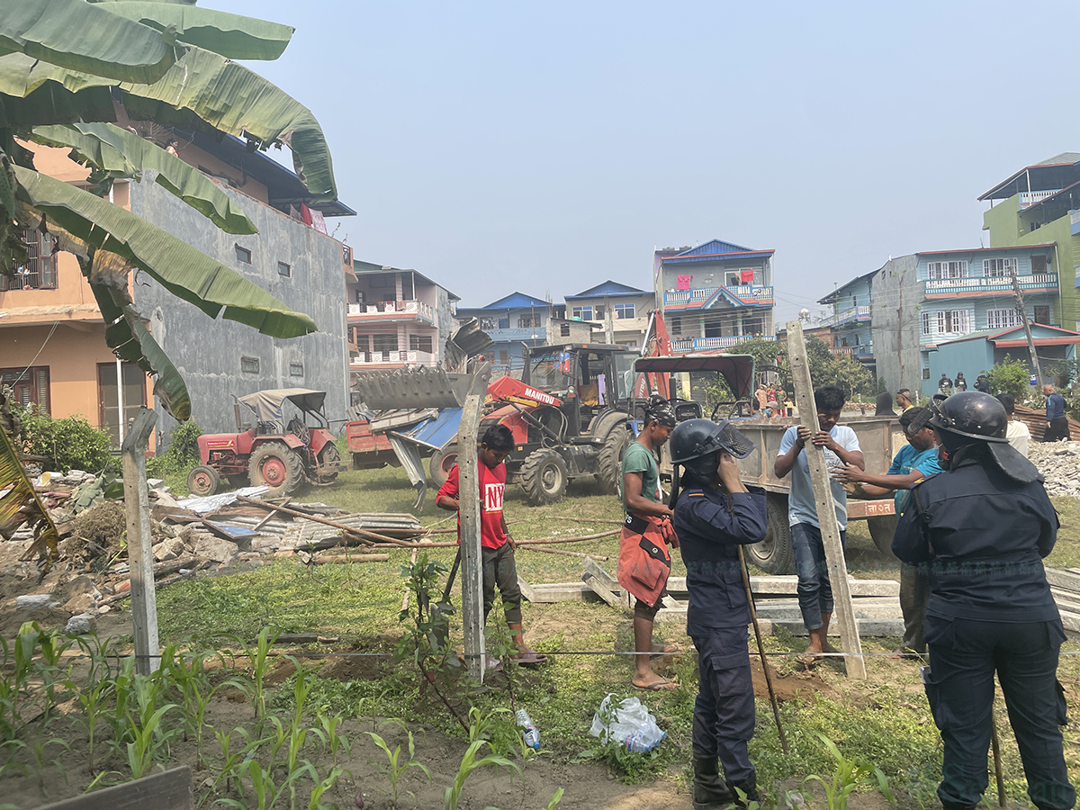 ‘फैसला कार्यान्वयन विशेष अभियानअन्तर्गत आज पनि हामी यो जमिन खाली गर्न पुगेका थियौं। काममा अवरोध भएपछि जनपथ प्रहरी र सशस्त्र प्रहरी बलको सहयोगमा खाली गर्नुपर्यो,’ पौड्यालले भने, ‘टिनले छाएका पुराना घरहरू भत्काएर वादी हरिप्रियाको नाममा रहेको २ कट्ठा १९ धुर जमिन छुट्टाइदिएका छौं।’