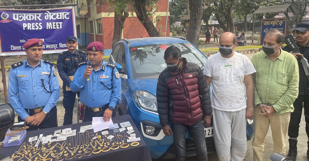 प्रहरीले डब्लुबी १२ एभी ५५६६ नम्बरको भारतीय गाडी र गहनासहित भारतको उत्तर प्रदेश राज्यको बलिया जिल्ला फेफना थाना बस्ने ४२ वर्षीय विनोद प्रसाद, पश्चिम बंगाल राज्यको हौडा जिल्ला गोलावाडी पुलिस थाना, सल्किया स्कुलरोड कलकत्ता बस्न ५१ वर्षका गणपतकुमार तोसावर र कारमा सवार सोही ठाउँका ४२ वर्षीय नरेश बर्मालाई पक्राउ गर्यो।