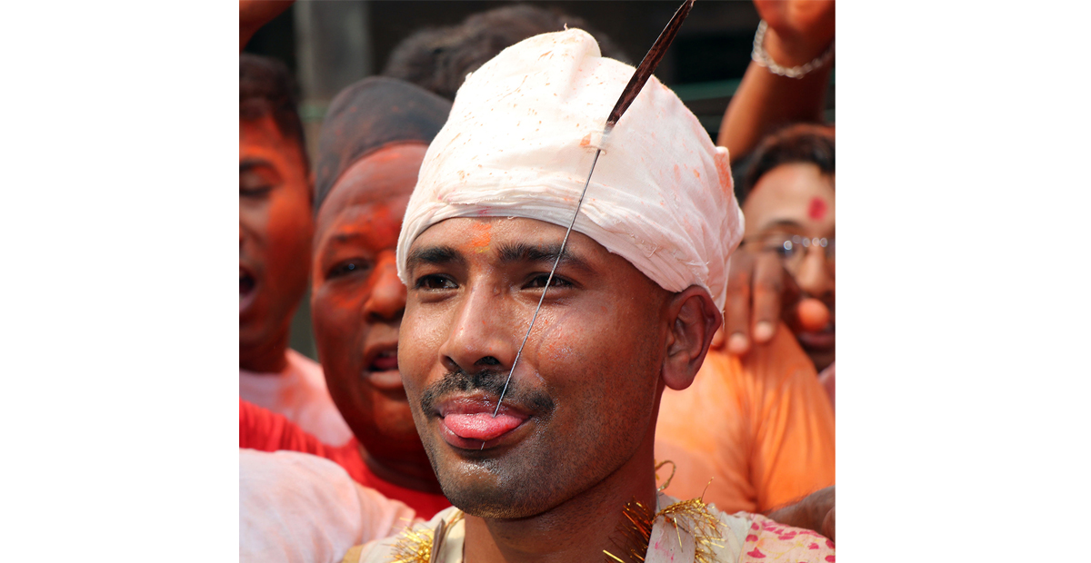 दिउँसो २ बजे बाँसको चिम्टी बजाउँदै एकहुल मानिस हातको साङ्लो बनाएर जिब्रो छेड्ने पाँचो गणेश मन्दिर क्षेत्रमा आएपछि सबैको ध्यान त्यतैतिर केन्द्रित भयो। बीचमा थिए, जिब्रो छेड्न तयार भएका २७ वर्षीय सुजन श्रेष्ठ। उनी सबै देवीदेवताको मन्दिरमा पुगेर पूजा गर्दै आइपुगे।