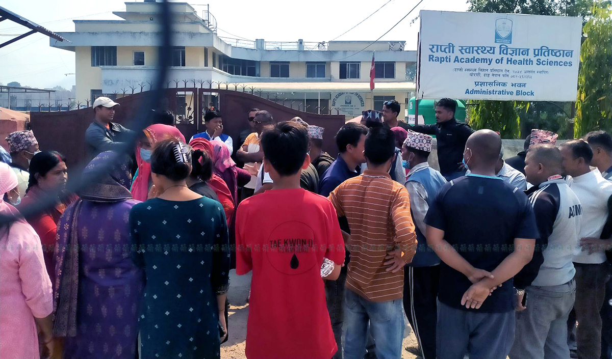 दाङको राप्ती स्वास्थ्य विज्ञान प्रतिष्ठान, घोराहीमा सुत्केरीको उपचारको क्रममा मृत्यु भएपछि आफन्तले अस्पताल घेरेका छन्।