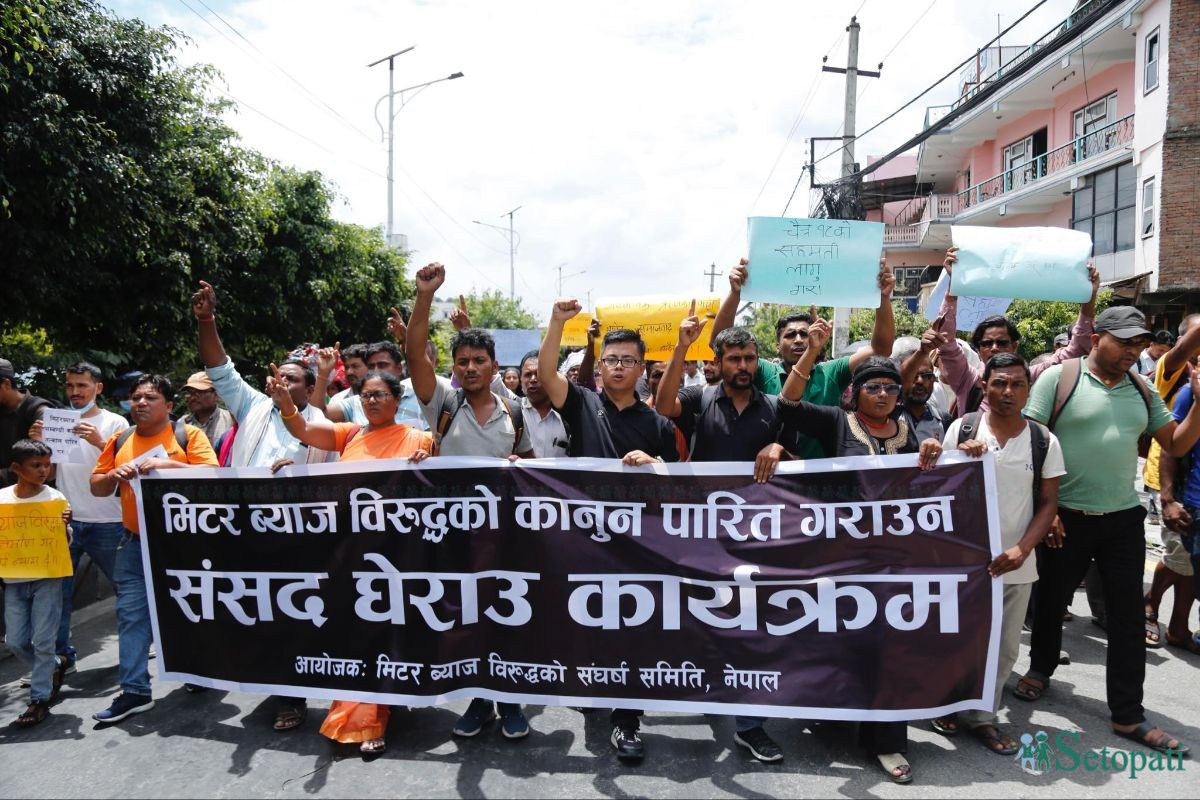 मिटरव्याजविरूद्ध कानून बनाउन माग गर्दै संघीय संसद भवन घेराउ भएको छ।