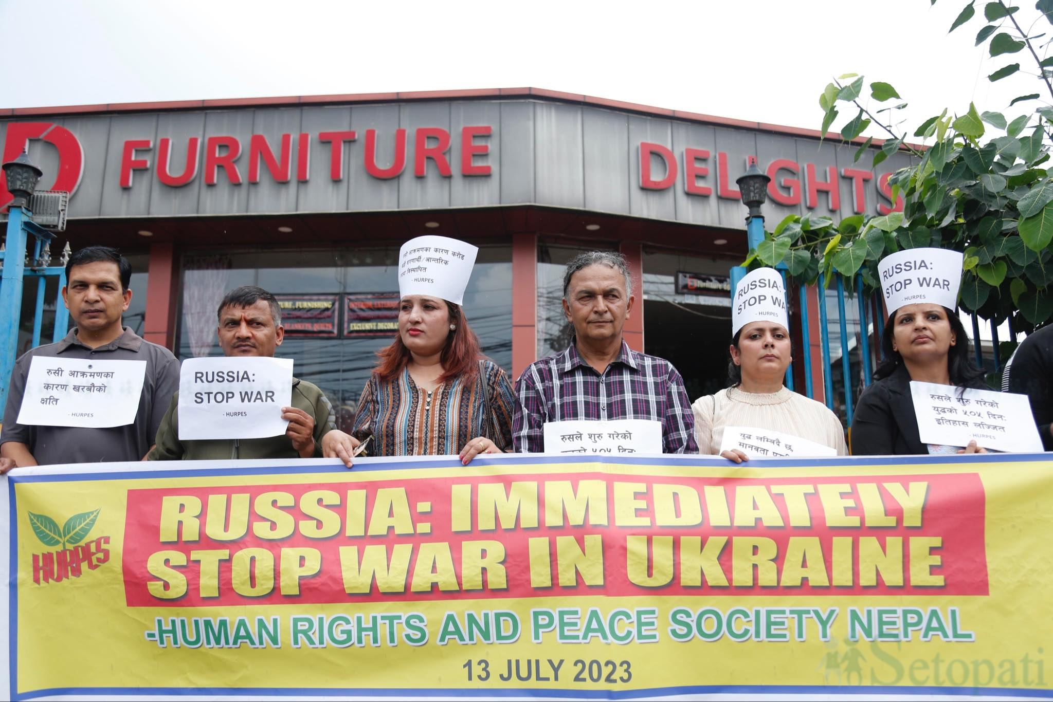 उनीहरूले रूसी आक्रमणका कारण हजारौं नागरिकको मृत्यु, रूसी आक्रमणका कारण करोड बढी शरणार्थी/आन्तरिक रूपमा विस्थापित, रूसले सुरू गरेको युद्धको ५०५ दिन: इतिहास लज्जित, रूसले सुरू गरेको युद्धको ५०५ दिन: मानवता पराजित लगायत प्लाकार्ड बोकेर प्रदर्शन गरेका हुन्।