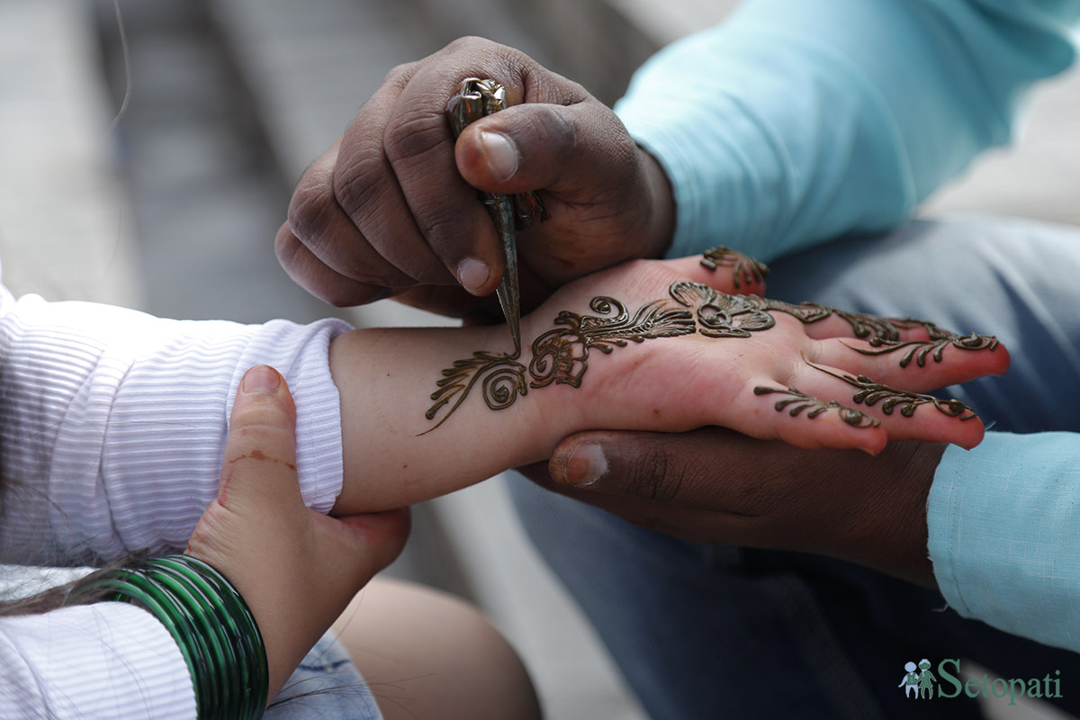 चुरासँगै अहिले मेहन्दीको व्यापार पनि फस्टाएको छ। साउनमा हरियो चुराजस्तै हत्केला, नाडी र नङमा मेहन्दी लगाउने चलन छ। साउनमा हत्केला, नङ, औंला र नाडीसम्म कलात्मक ढङ्गले लगाइने मेहन्दीले पतिपत्नीबीच प्रेममा प्रगाढता हुने र सर्पको भय नहुने विश्वास गरिन्छ। हरियो रङलाई समृद्धिको प्रतीक पनि मानिन्छ।