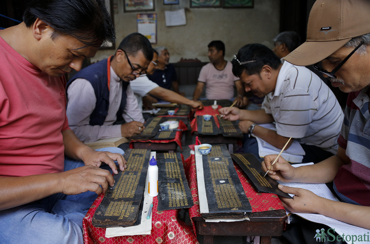 'गोल्डेन टेम्पल' भनेर चिनिने पाटनको हिरण्यवर्ण महाविहार (क्वः बहा) मा करिब ८ सय वर्ष पुरानो बौद्धग्रन्थ 'प्रज्ञापारमिता' सुनको अक्षरले जीर्णोद्धार भइरहेको छ।