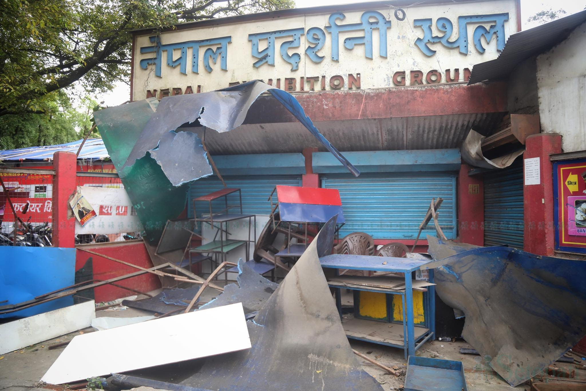 काठमाडौं महानगरपालिकाले प्रदर्शनी मार्गस्थित पर्यटन भवन नजिकैको टहरामा डोजर चलाएको छ।