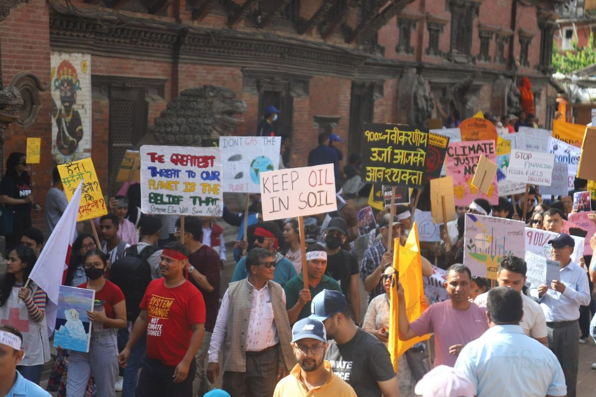युवाहरूले खनिज इन्धनको अन्त्यको माग गरिएका प्लेकार्डहरू बोकेका थिए। पाटन दरबार क्षेत्रमा पुगेर उनीहरूले नाचगान समेत गरेका थिए।