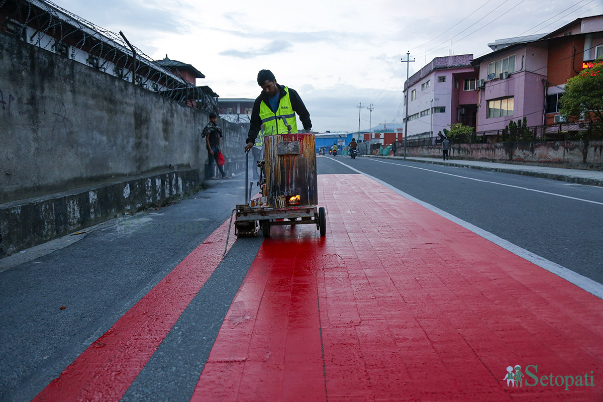 भक्तपुरको सूर्यविनायकदेखि काठमाडौंको रत्नपार्कसम्म द्रुत बस सेवाका लागि सडक विभागले रातो रङ पोतेर लेन छुट्ट्याउन थालेको छ।