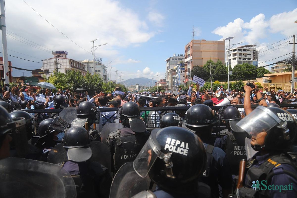 नयाँ बानेश्वरस्थित एभरेष्ट होटल अगाडिबाट निषेधित क्षेत्र तोकिएको छ। मार्च पास गर्दै शिक्षकहरू त्यहाँ भन्दा अगाडि बढ्न खोजेपछि प्रहरीले रोक्ने क्रममा धकेलाधकेल भएको हो।
