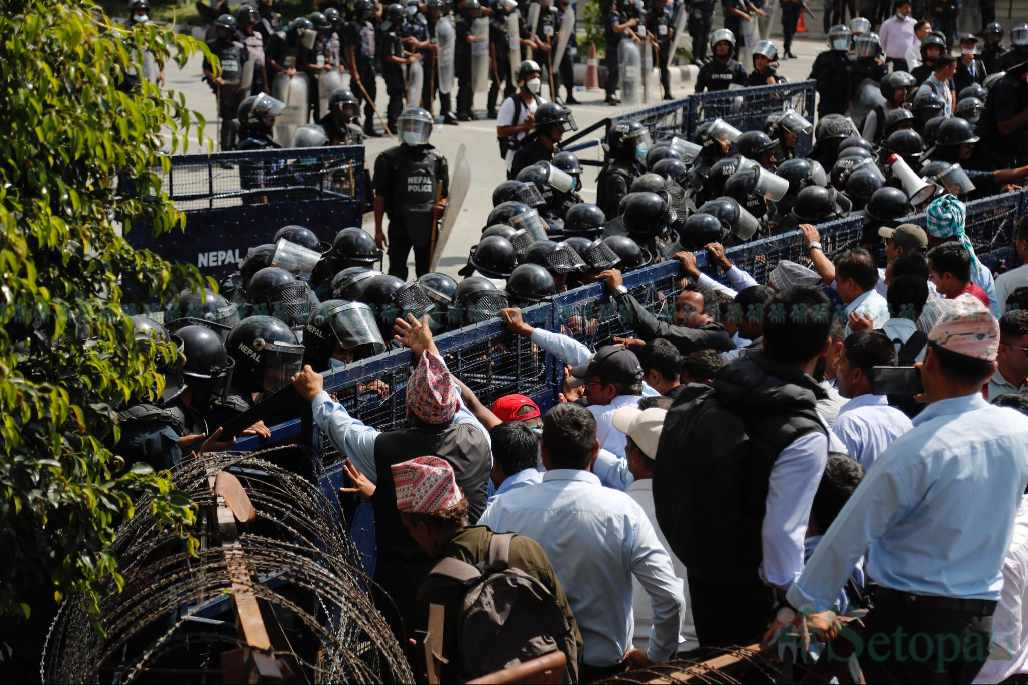 प्रहरीले लगाएको ब्यारिकेडलाई उनीहरूले धकेलेर तोड्ने प्रयास गरेका हुन्। प्रहरीले पनि त्यसलाई रोक्न माइकिङ गर्ने गरिरहेको छ।