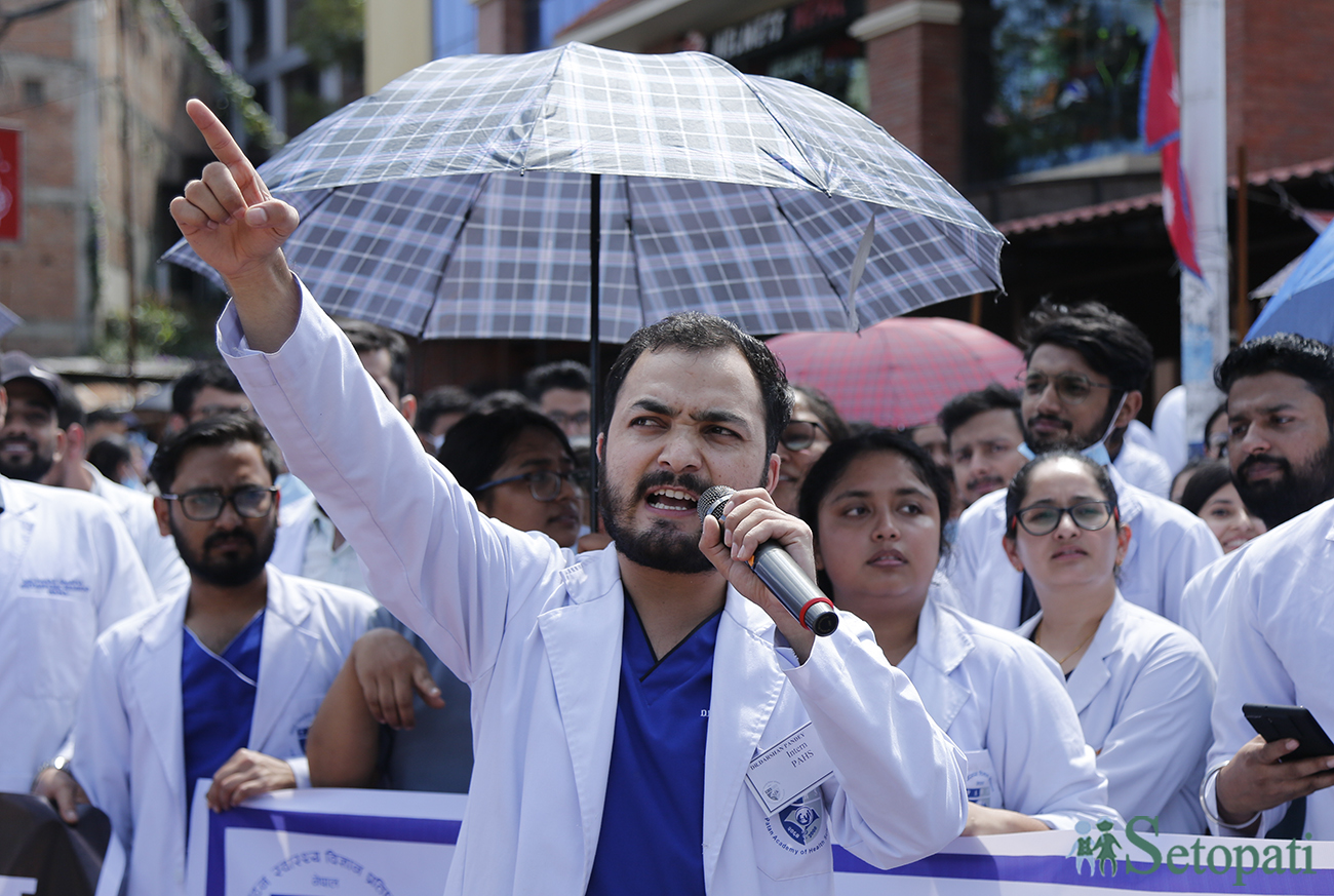 मंगलबार काठमाडौंको माइतीघर मण्डलमा चिकित्सकहरूले विरोध प्रदर्शन गरेका हुन्।