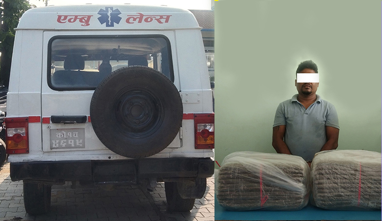 को १ च ४६१९ को एम्बुलेन्सको डिकीमा राखी ल्याइएको २१.५ किलोग्राम गाँजा र नेपाली रुपैयाँ ४० हजार बरामद गरेको प्रहरीले जनाएको छ।