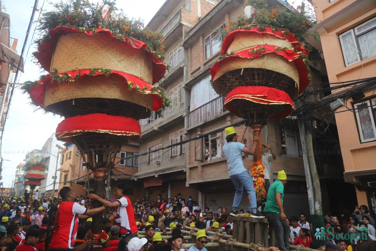 यो जात्रामा तीन वटा रथ हुन्छन्, गजुरमुनि र रथमाथि देवता (ईश्वर नारायण) राखिएको हुन्छ। अरू जात्रा गर्ने रथमा माथि गजुर हुन्छ।