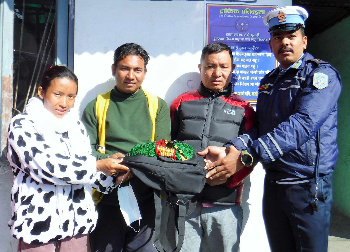 ट्याक्सीमा छुटेका सुनचाँदीका गरगहना सहितको झोला खोजी गरी काठमाडौं उपत्यका ट्राफिक प्रहरी कार्यालयको खोजतलास शाखाका प्रहरी निरीक्षक विशाल सिंहले आइतबार धनीलाई हस्तान्तरण गरेका हुन्।