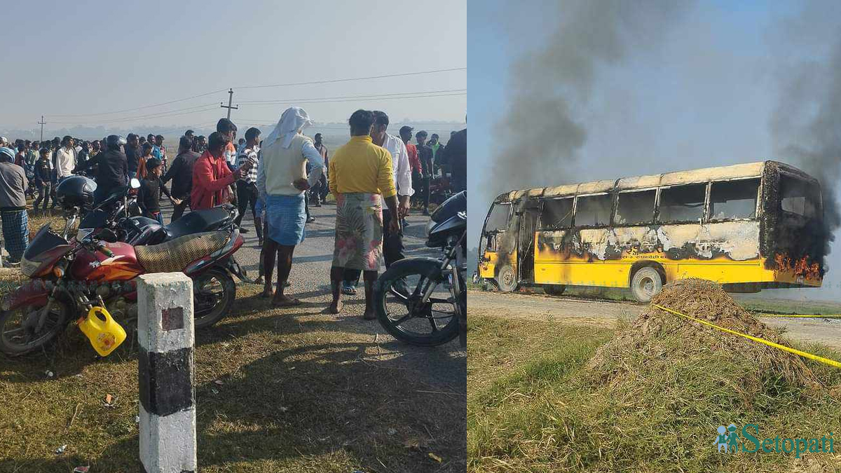 बसको ठक्करबाट मोटरसाइकलमा सवारहरुको मृत्यु भएपछि आक्रोशित स्थानीयले स्कुल बसमा आगो लगाइदिएका छन्। आगलागीबाट बस पूर्ण रुपमा क्षती भएको छ।