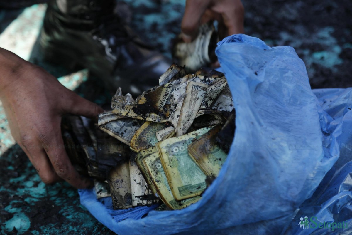 प्रहरी वृत्त बानेश्वरका डिएसपी शिवराज बुढाथोकीका अनुसार एक सय, पाँच सय र हजार रुपैयाँका नोट जलेको अवस्थामा फेला परेको छ।