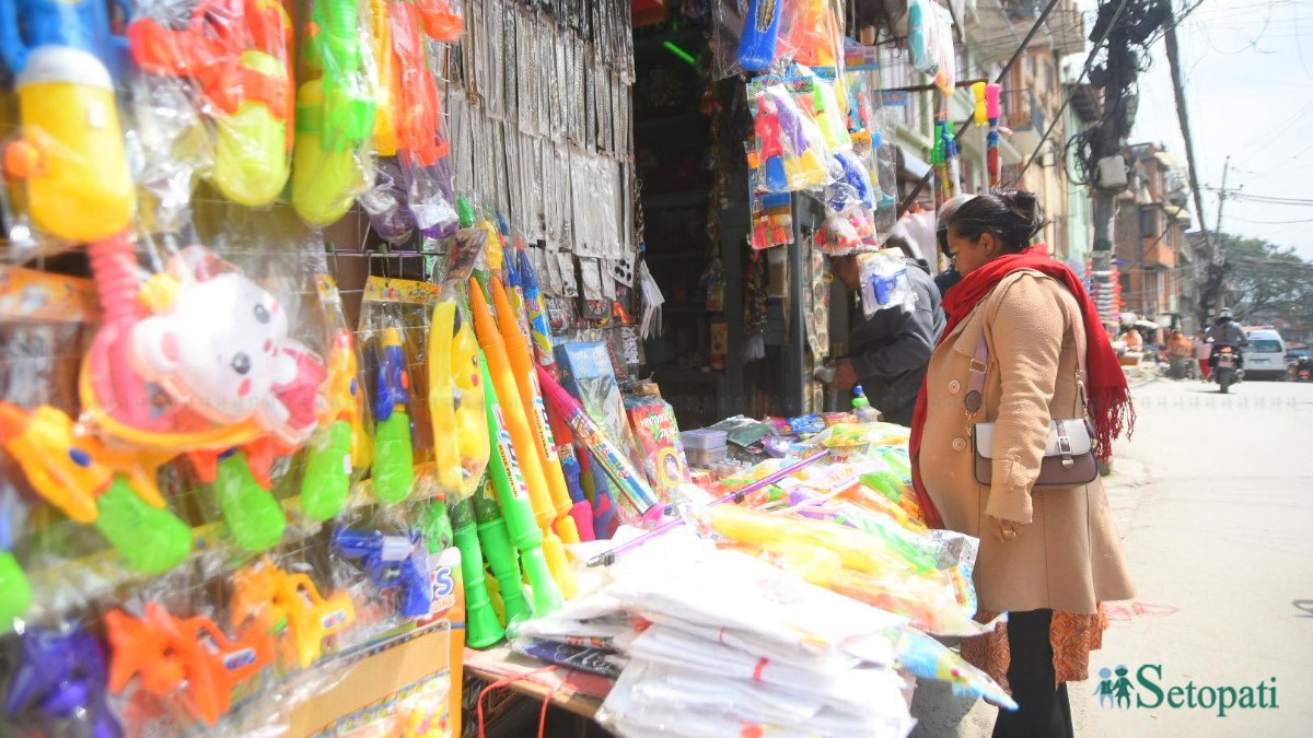 काठमाडौं होलीको समयमा टिसर्ट, रङ, पिच्कारी लगायतका सामग्रीको माग ह्वात्तै बढ्छ। त्यसो हुँदा बजारमा मानिसहरूको बाक्लो चहलपहल हुनेगर्छ।