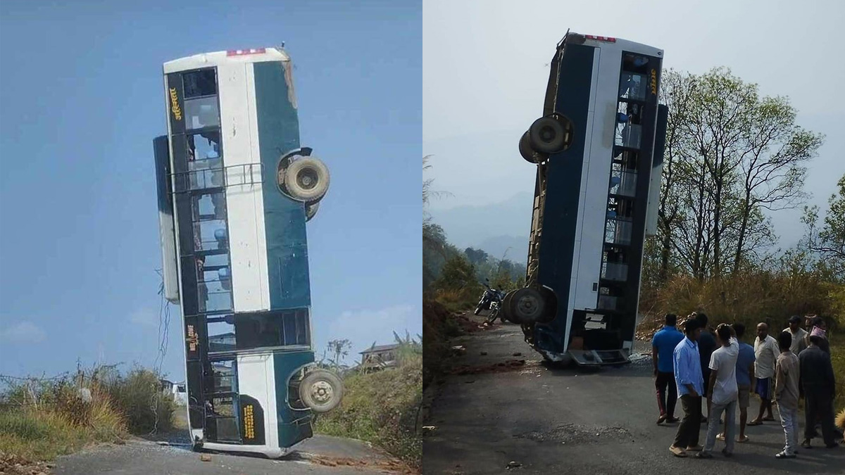 बसको अघिल्लो भाग भुइँमा र पछाडिको भाग आकाशतिर फर्किएर बस टक्कले अडिएको छ।