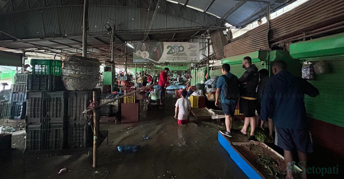 शुक्रबार रातिदेखि अविरल वर्षाका कारण  बागमती नदीमा आएको बाढी तरकारी बजारमा छिरेको हो।
