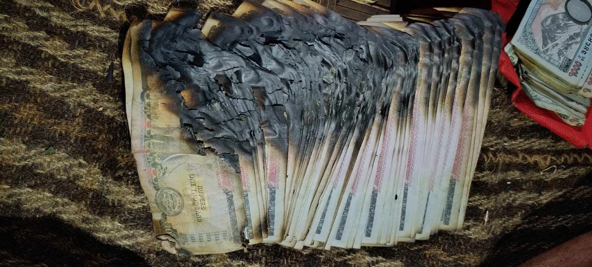 नोटहरूको आधा भाग जलेको अवस्थामा फेला परेको छ। आगलागीबाट गोठमा रहेको भेडाको ऊन, कपडा, सोलार प्यानल, अन्नपातसहित ६ लाख २० हजार बराबरको क्षति भएको प्रहरी निरीक्षक शाहीले बताए।