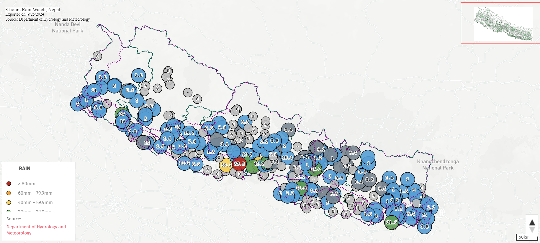 विभागले अद्यावधिक गरेको सूचनाअनुसार नवलपरासीको देउरालीमा पछिल्लो ३ घन्टामा ८३.२, मिलिमिटर वर्षा भएको छ। यो भारी वर्षा मापन हो।