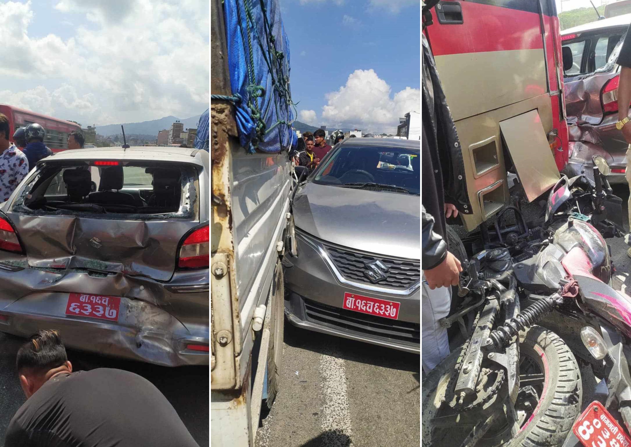 काठमाडौं उपत्यका ट्राफिक प्रहरी कार्यालयका प्रवक्ता डिएसपी रविन कार्कीका अनुसार गुडिरहेको बस, मोटरसाइकल, कार र डिआइ गाडी दुर्घटनामा परेका हुन्।
