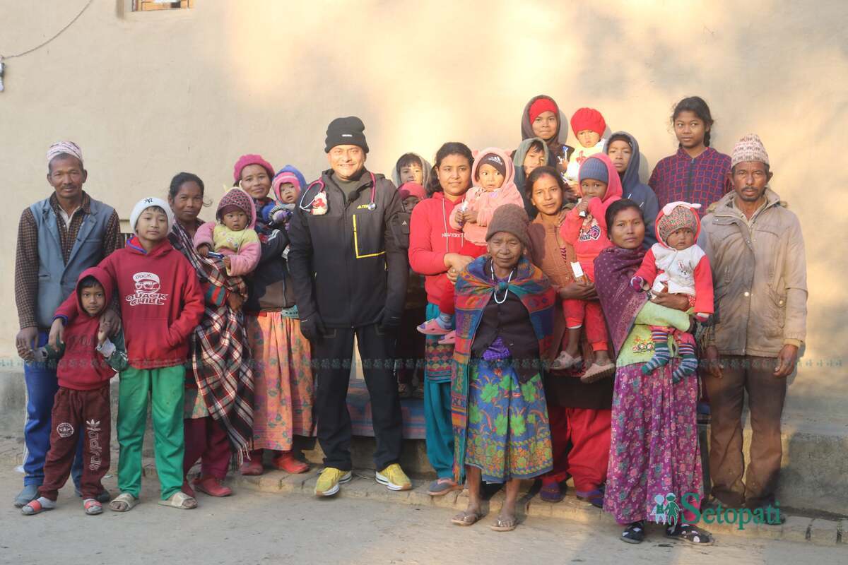 उनी केही बेरमा टिकरीस्थित थारू गाउँ पुगे। उनलाई देख्नासाथ स्थानीय बासिन्दा बालबच्चा लिएर आइपुगे।