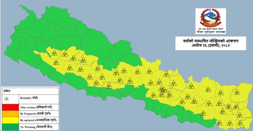 विभागका अनुसार असोज १४ गते अष्टमीका दिन बागमती र गण्डकी प्रदेशका पहाडी तथा कोशी प्रदेशका पहाडी र तराई भू–भागका केही स्थानहरूमा हल्कादेखि मध्यम वर्षा प्रक्षेपण गरिएको छ।